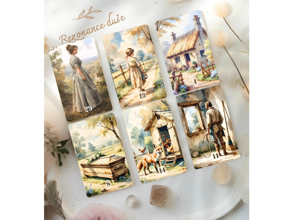 36 tradičních Lenormand karet v jemném akvarelovém stylu, který působí něžně a poeticky.